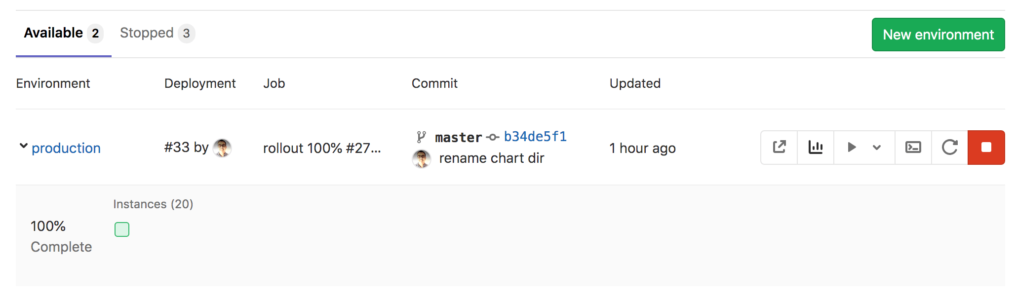 - Stop environment ({stop}) - For more information, see Stopping an environment