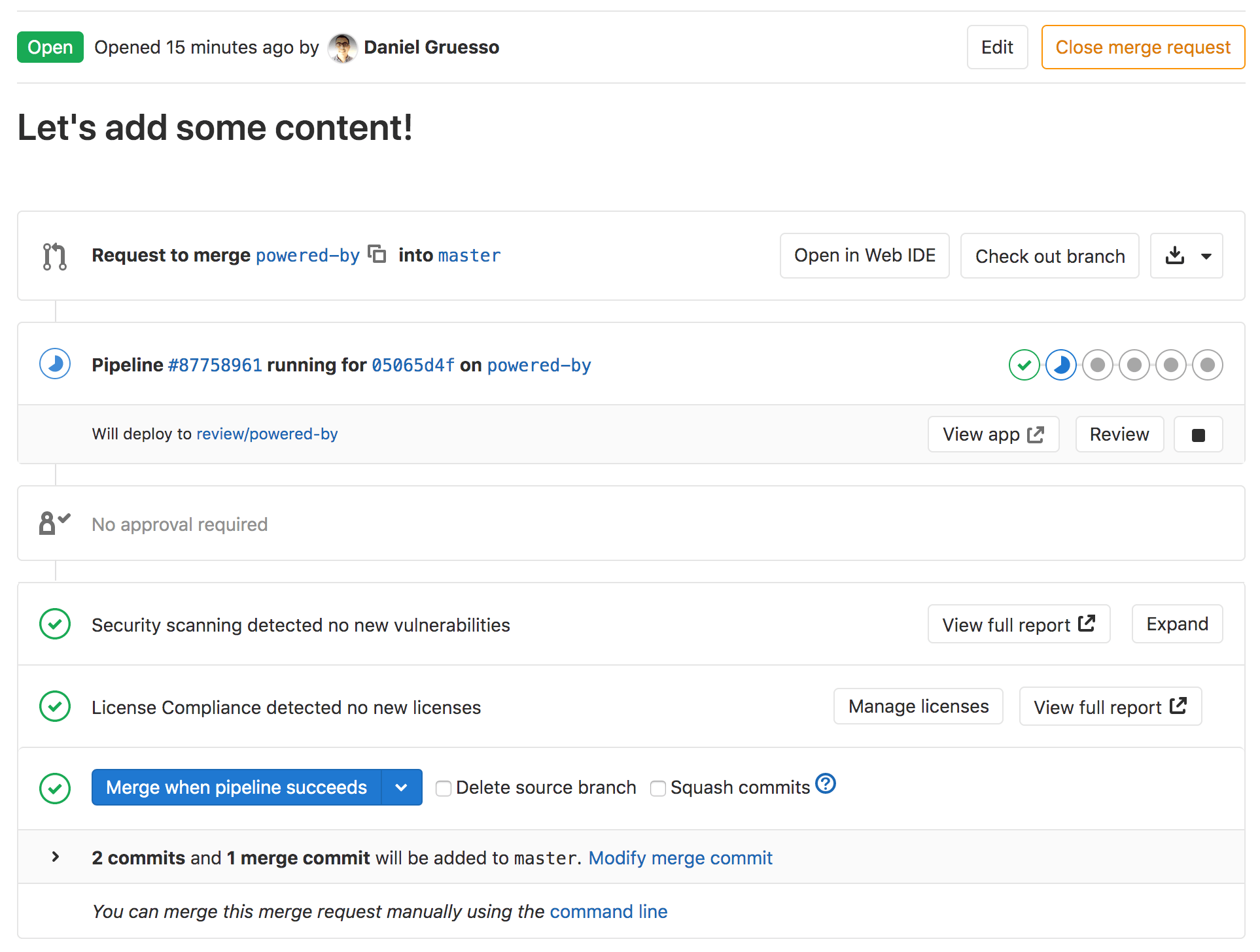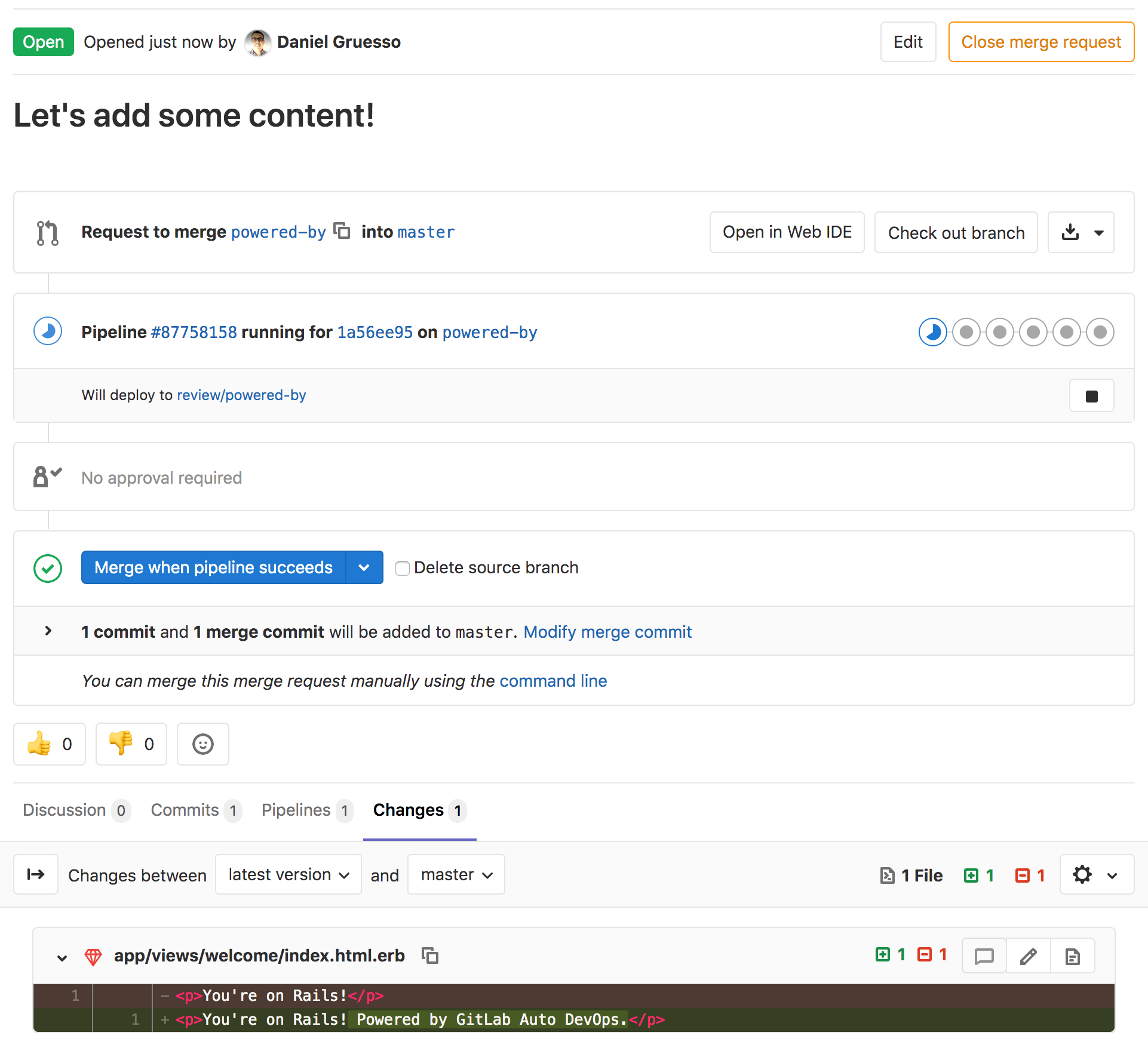 Return to the Overview page of your merge request, and you should not only see the test passing, but also the application deployed as a review application. You can visit it by clicking the View app {external-link} button to see your changes deployed.