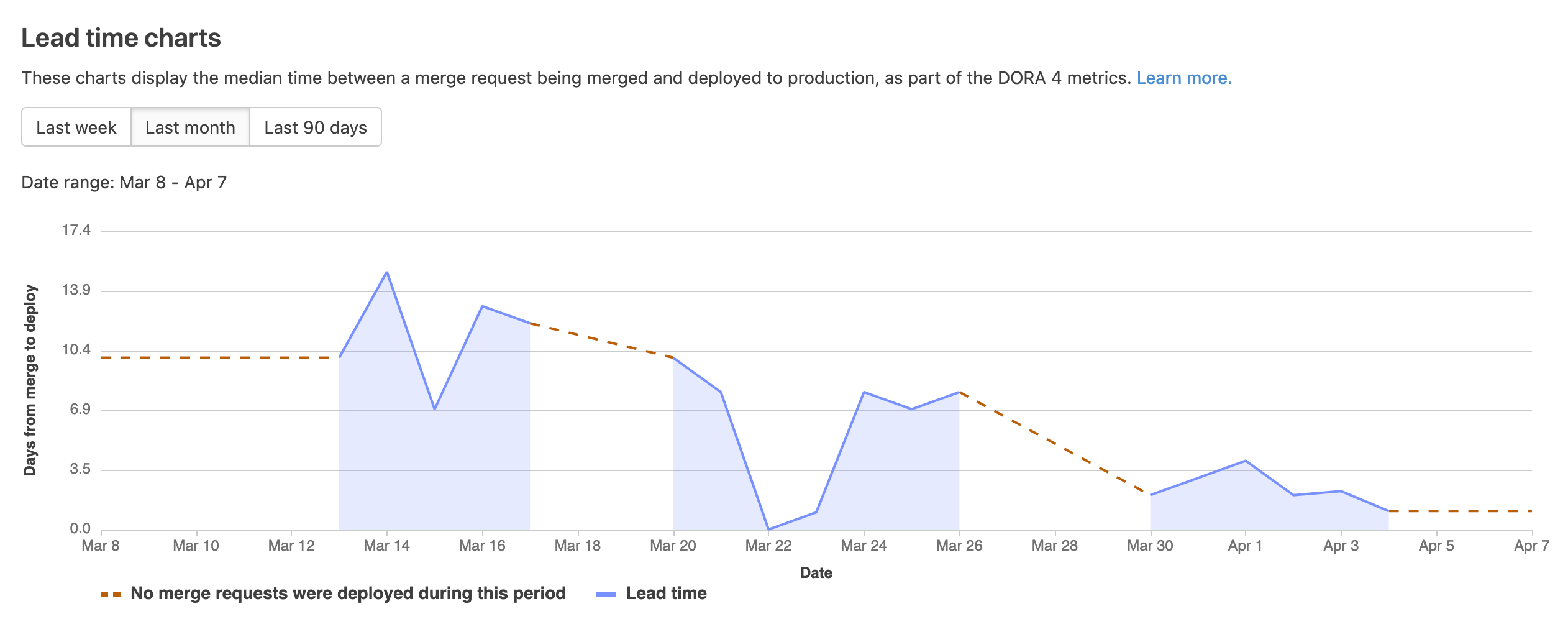 For time periods in which no merge requests were deployed, the charts render a red, dashed line.