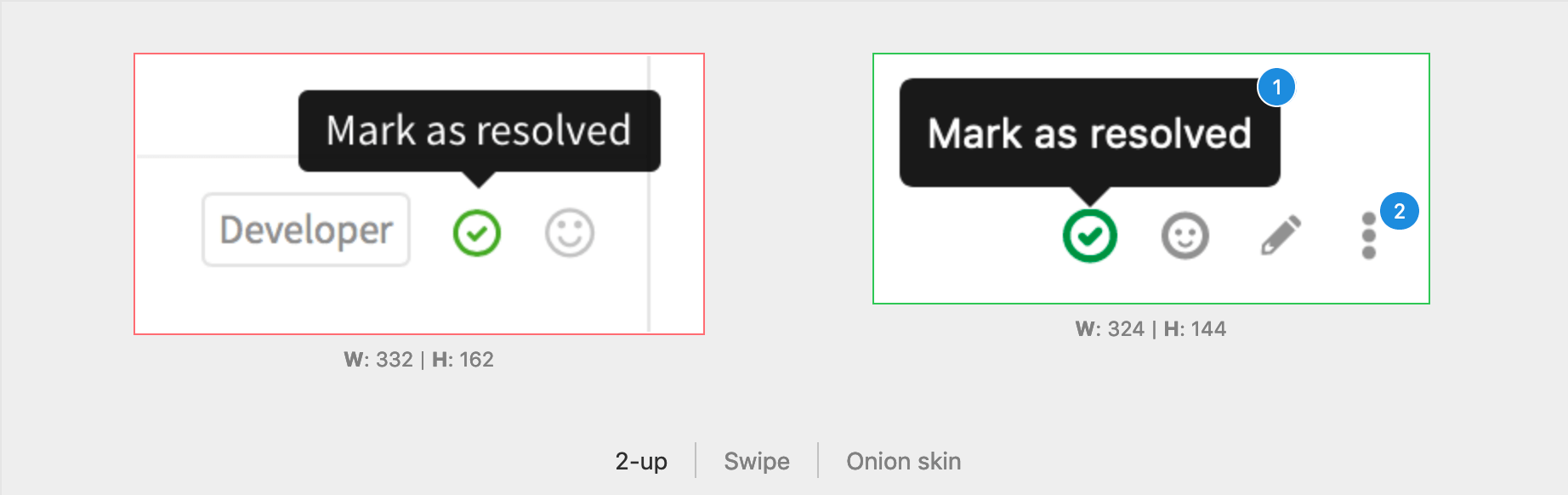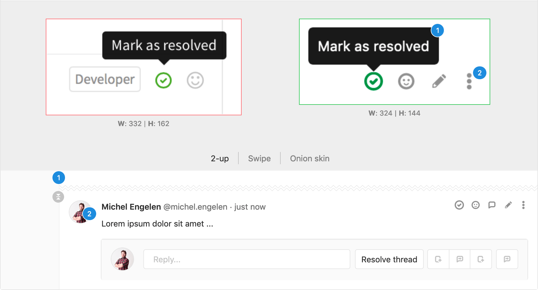 Image threads also work on diffs that replace an existing image. In this diff view mode, you can toggle the different view modes and still see the thread point badges.