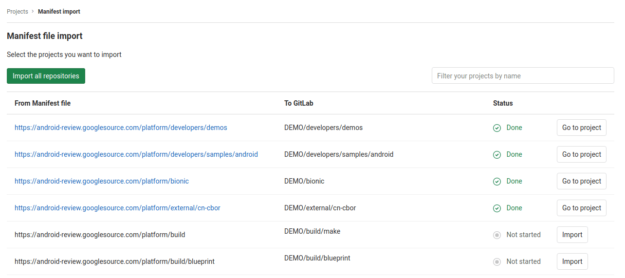GitLab allows you to import all the required Git repositories based on a manifest file like the one used by the Android repository. This feature can be very handy when you need to import a project with many repositories like the Android Open Source Project (AOSP).