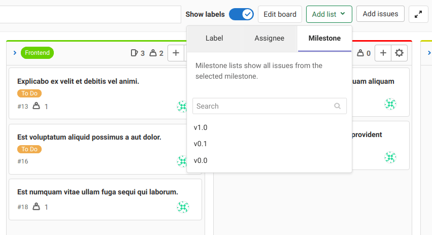Issue boards help you to visualize and manage your entire process in GitLab. You add your labels, and then create the corresponding list for your existing issues. When you're ready, you can drag your issue cards from one step to another one.
