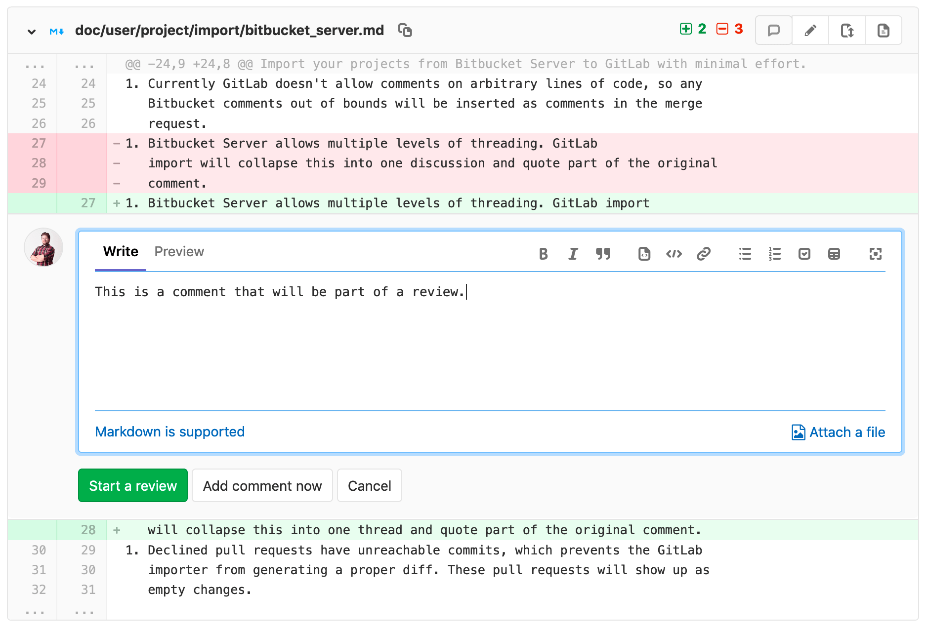 - Write your first comment, and select Start a review below your comment: