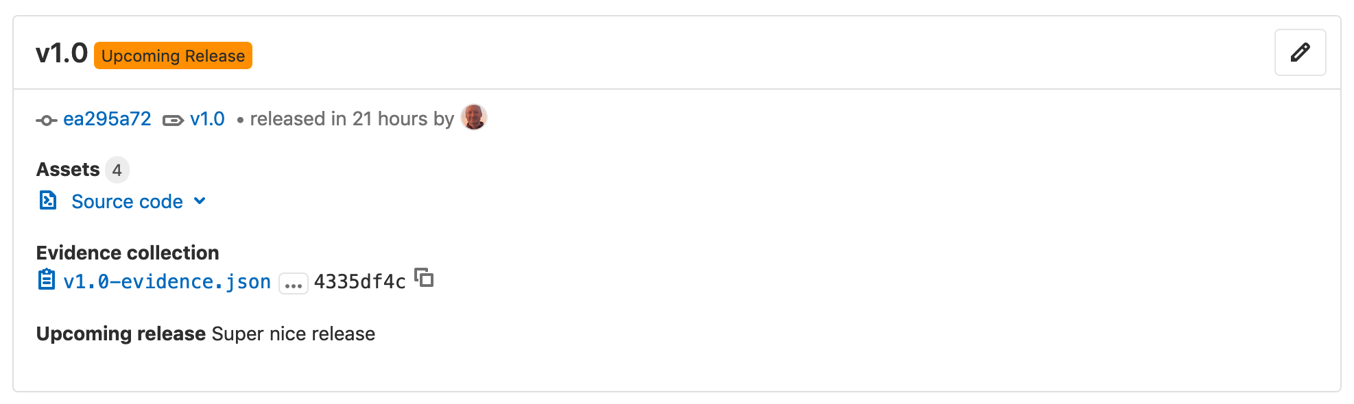 Each time a release is created, GitLab takes a snapshot of data that's related to it. This data is saved in a JSON file and called release evidence. The feature includes test artifacts and linked milestones to facilitate internal processes, like external audits.